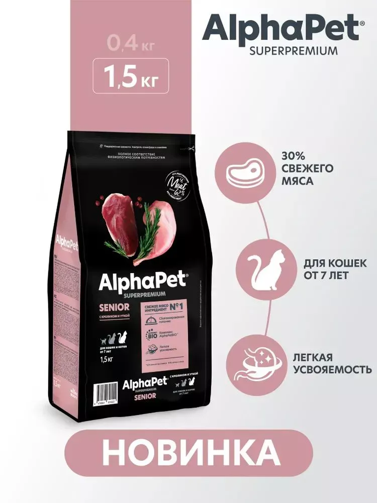 AlphaPet Superpremium (АльфаПет) 1,5кг с кроликом и уткой сухой для кошек от 7 лет (656022)