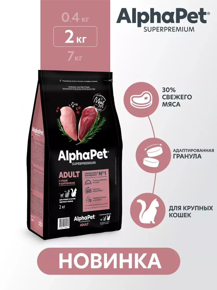 AlphaPet Superpremium / Сухой полнорационный корм с уткой и цыпленком для кошек и котов крупных пород