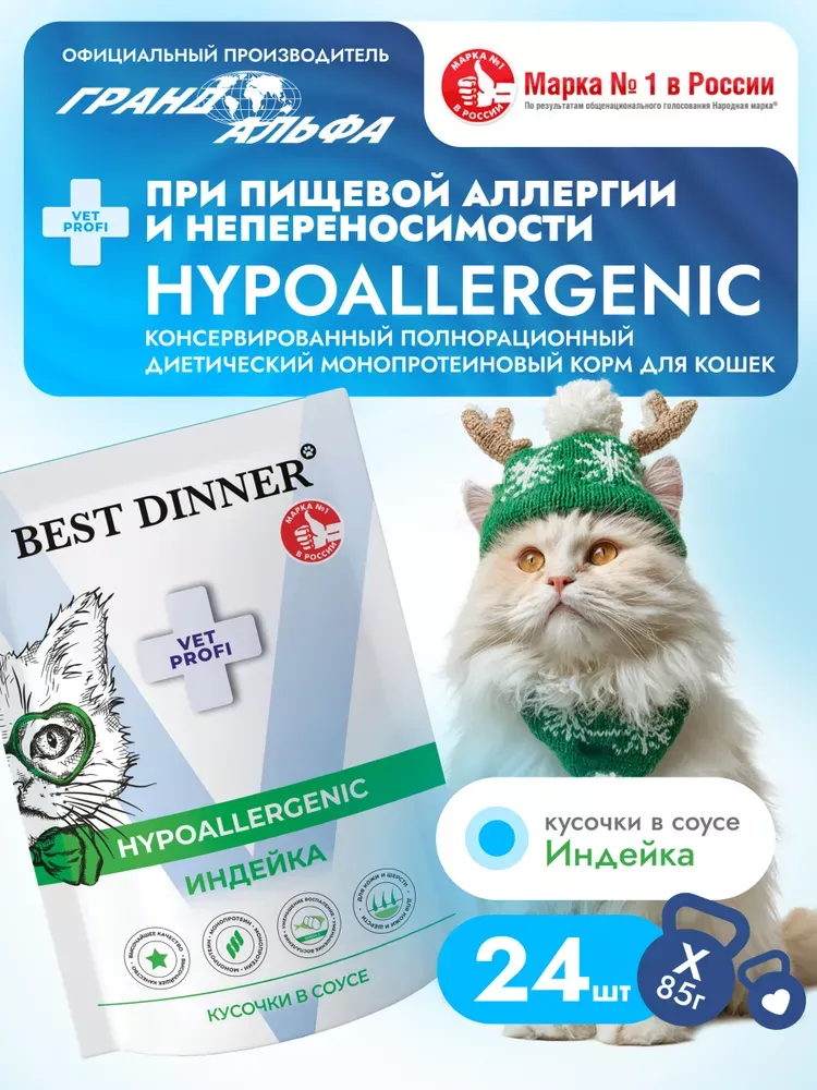 Best Dinner Vet Profi Hypoallergenic 0,085кг диета при пищевой аллергии, индейка кусочки в соусе для кошек (409440)