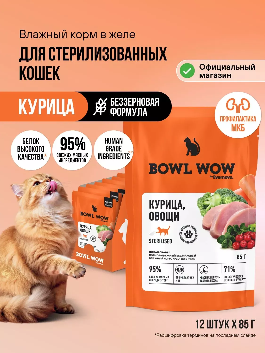 И вкусно, и полезно! Натуральный влажный корм BOWL WOW™ разработан совместно с ветеринарными специалистами с учетом потребностей стерилизованных питомцев. Свежая курица и самые полезные мясные субпродукты приготовлены в сочном желе и дополнены овощами и диетической клетчаткой.