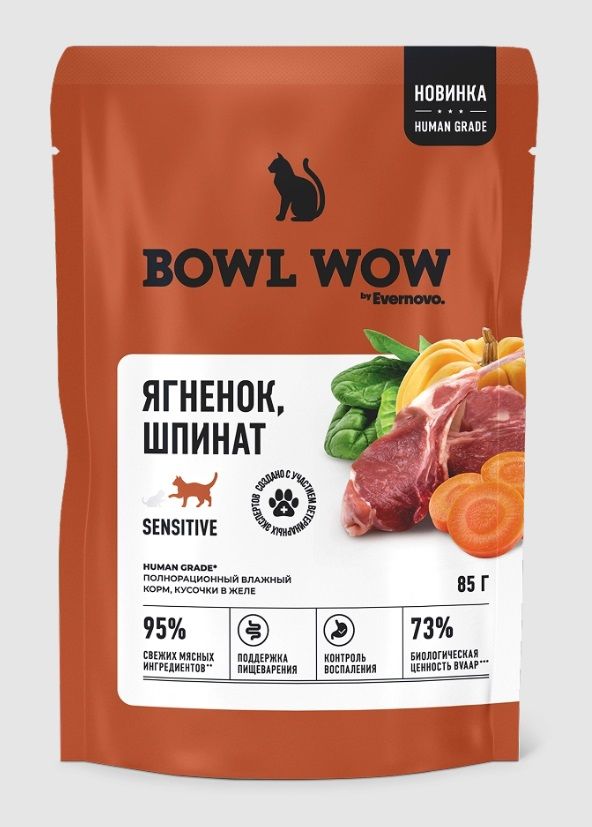 Bowl Wow 0,085кг ягненок и шпинат в кусочки в желе для кошек с чувствительным пищеварением (665151)
