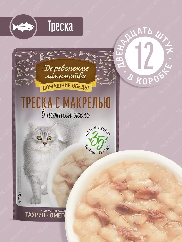 Деревенские лакомства 0,07кг Домашние обеды Треска с макрелью в нежном желе для кошек, пауч (79219890)