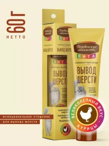 Функциональная паста «Вита. Вывод шерсти» со вкусом курицы является незаменимым помощником в заботе о благополучии вашей кошки. Её уникальная формула помогает деликатно выводить комочки шерсти, накапливающиеся в пищеварительном тракте и при регулярном приеме способствует эффективному предотвращению появления новых комочков. Каждая порция пасты обогащена витаминами и минералами. Вкус курицы добавляет пасте привлекательности, что делает ее прием не только полезным, но и приятным времяпрепровождением для вашего питомца.