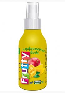 Парфюмерная вода «Фрутти» для собак и кошек состоит из: воды очищенной, ПЭГ-40 гидогенизированного касторового масла, пропиленгликоля, отдушки, экстрактов малины, груши, грейпфрута, манго или банана (в зависимости от вида), диметикона и консервантов нового поколения.