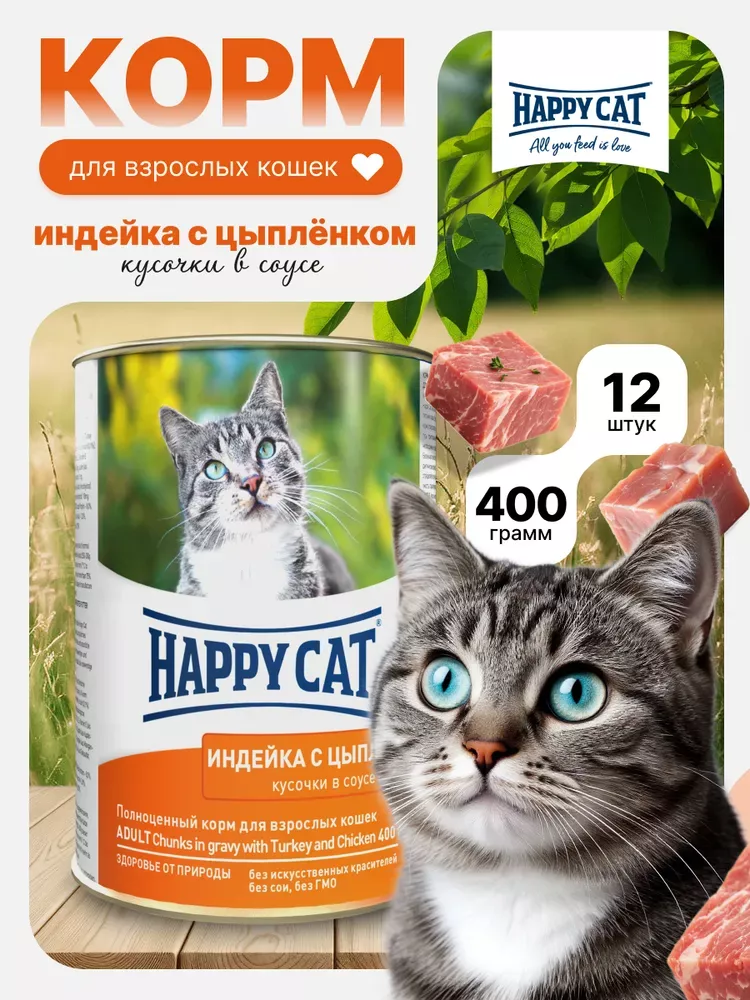 Полноценный консервированный корм Happy Cat Индейка с Цыпленком кусочки в соусе не оставит равнодушной ни одну кошку. Очень вкусный и натуральный корм включает отобранные ингредиенты, которые содержат необходимые витамины и микроэлементы. Уникальная технология приготовления позволяет сохранить все ценные свойства натуральных продуктов, чтобы ваш питомец был здоров и полон сил. Содержится инулин - натуральный пребиотик, улучшающий пищеварение вашего питомца. Влажные корма - профилактика мочекаменной болезни. Кошки легко переносят незначительное обезвоживание. Они унаследовали эту особенность от своих предков (диких африканских кошек), которые приспособились к условиям крайне сухого климата. Кошки научились компенсировать потери воды за счет концентрации мочи. Чтобы уберечь кошку от возникновения мочекаменной болезни, мы рекомендуем давать влажные корма как дополнительный источник воды.