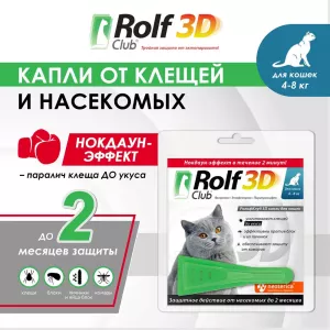 Капли (Rolf Club) 3D (1пип) от клещей, блох и комаров для кошек более 4кг (ЛИЦЕНЗИЯ)
