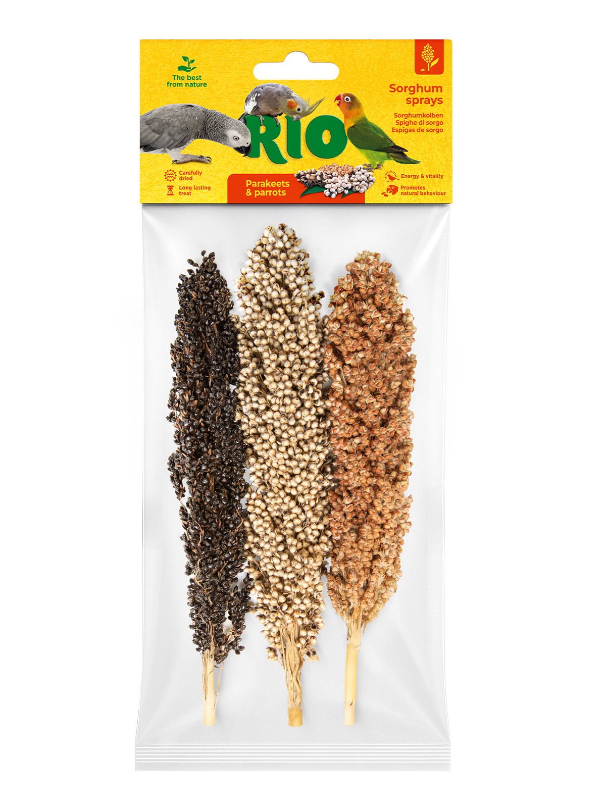 RIO Сорго в колосьях — природное и питательное лакомство для средних и крупных попугаев. Колоски стимулируют естественные инстинкты птиц, делая процесс кормления более интересным и увлекательным.