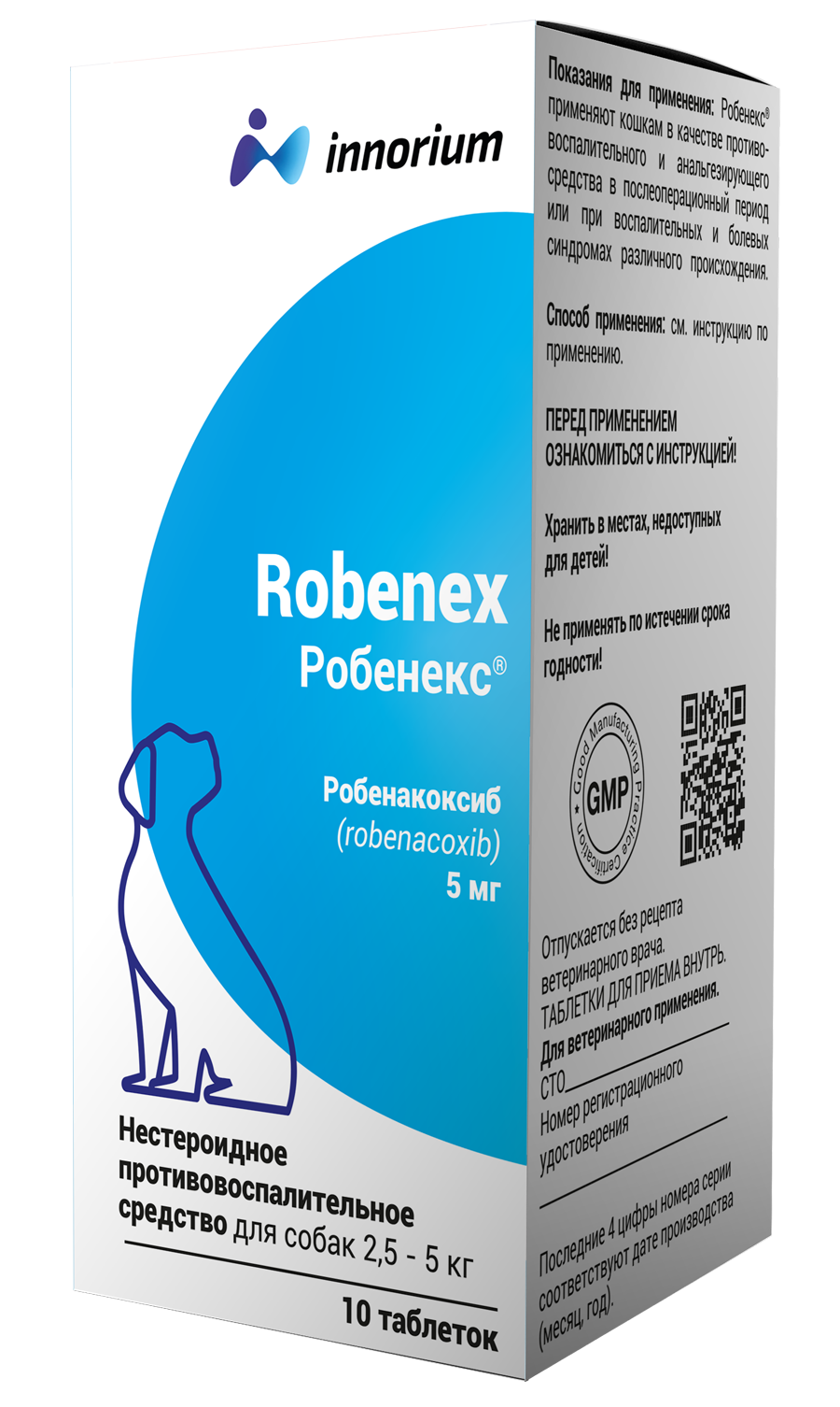 При оперативных вмешательствах у собак Робенекс применяют за 30 минут до введения в наркоз в дозе 1-2 мг на 1 кг массы животного, в послеоперационный период лечение может быть продолжено до 14 дней.