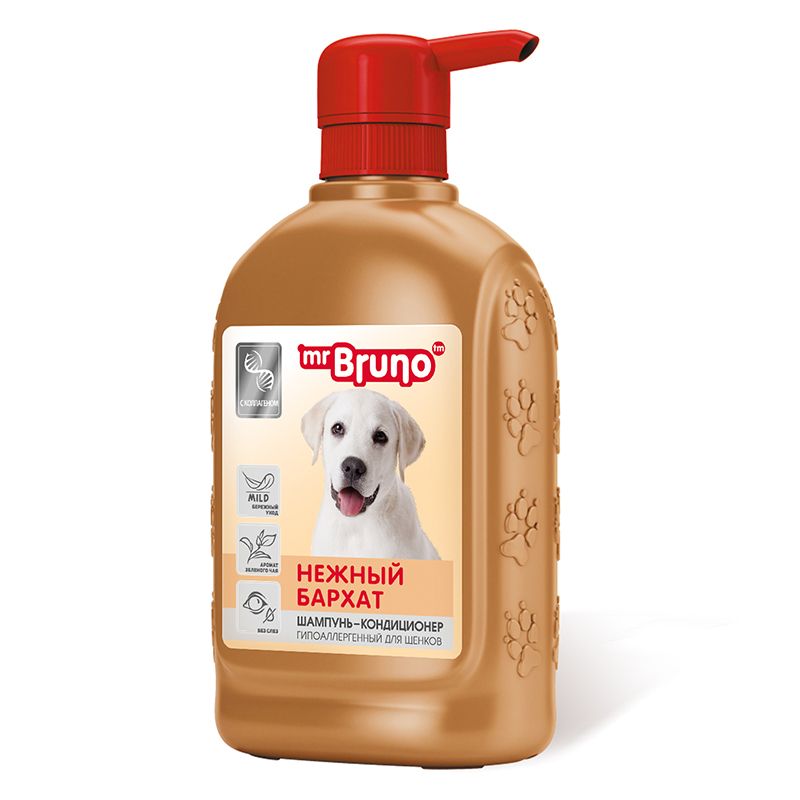 Шампунь-кондиционер Mr. Bruno 'Нежный бархат' идеально подходит для щенков всех пород, а также склонных к аллергии, больных, ослабленных или стареющих животных.