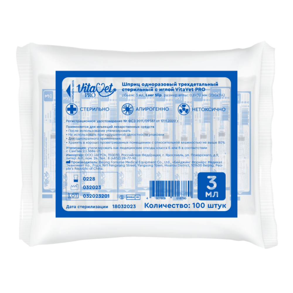 Шприц 3мл 3-х компонентный VitaVet PRO с иглой 23G 0,6х32мм, 100шт.
