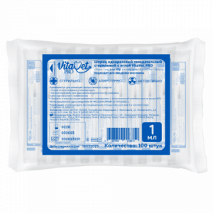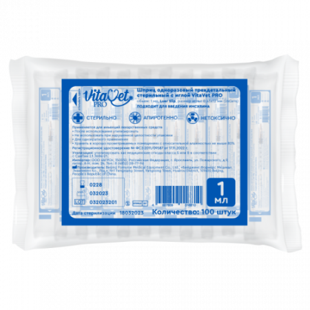 Шприц однор. 1 мл 3-х комп инсулиновый Vitavet Pro с иглой 26Gх1/2 0,45х12мм 100 шт/уп