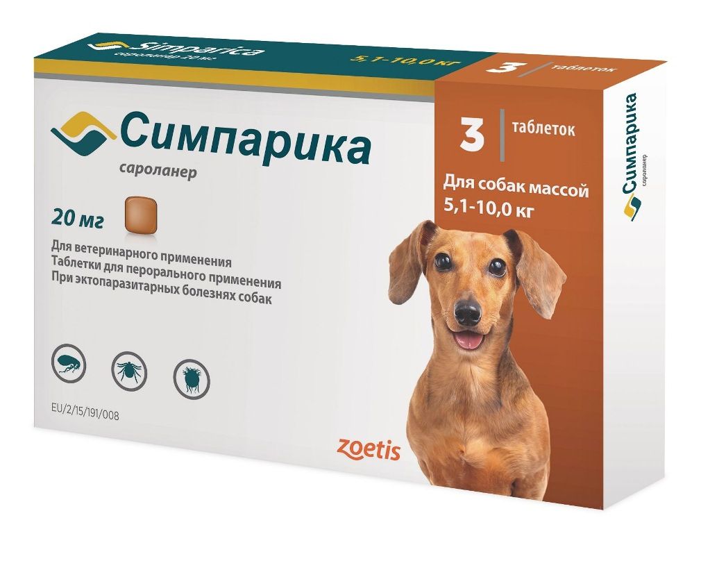 Симпарика 20мг (3таб.) от блох и клещей для собак 5,1-10,0кг (1таб./5недель) (ЛИЦЕНЗИЯ)