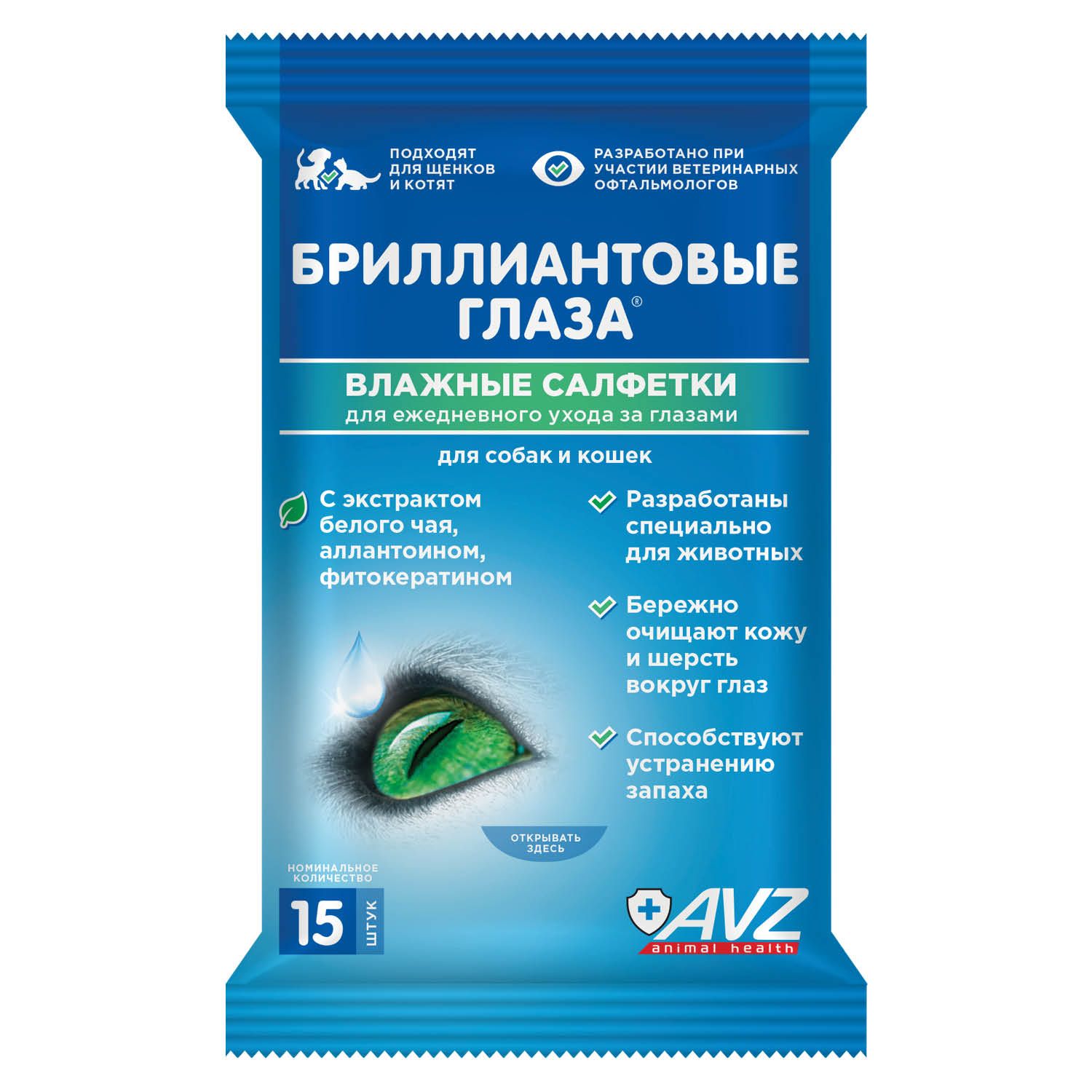 Салфетки разработаны при участии ветеринарных офтальмологов специально для ухода за глазами и очистки шерсти и кожи вокруг глаз животного. Они бережно удаляют выделения из глаз. Избавляют от «слёзных дорожек». Способствуют устранению запаха от выделений из глаз. Подходят для применения котятам и щенкам.