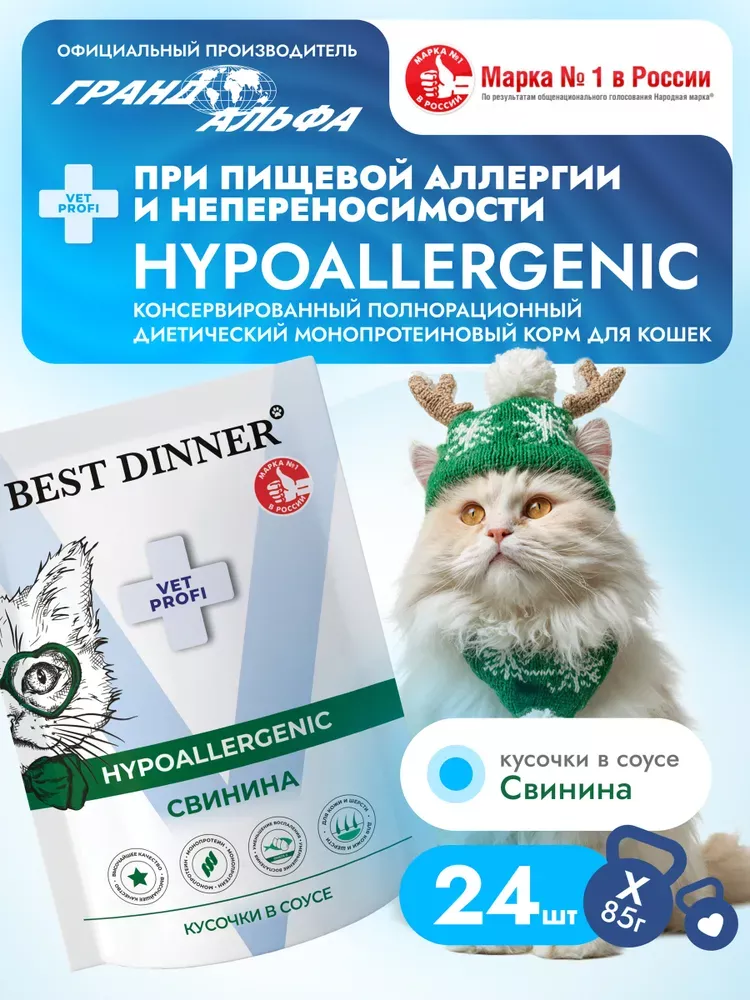 Best Dinner Vet Profi Hypoallergenic 0,085кг диета при пищевой аллергии, свинина кусочки в соусе для кошек (409433)