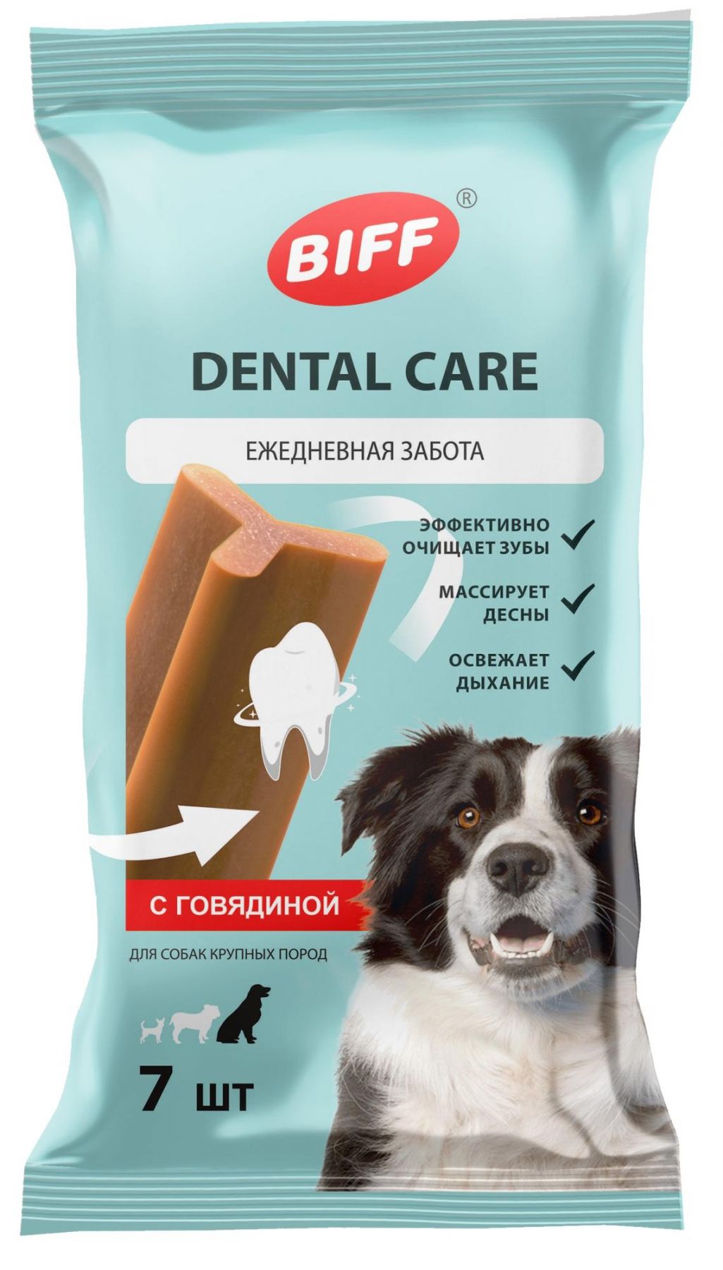 Biff Dental Care - это жевательный снек, необходимый для ежедневного ухода за ротовой полостью собак. Особая текстура и форма способствуют эффективному снятию мягкого зубного налета, снижению риска образования зубного камня и массажу десен. Фитокомплекс экстрактов растений предотвращает размножение вредных бактерий и освежает дыхание.В отличии от аналогов, в составе нет курицы, которая чаще всего вызывает аллергическую реакцию у питомца. Лакомства – это дополнительное питание, не заменяющее ежедневное полноценное кормление. Пожалуйста, оставляйте питомцу миску со свежей питьевой водой. Пищевая ценность в 100г: белки 7г, жиры 2,5г, зола 2,5г, клетчатка 2г, влага 20г. Энергетическая ценность на 100г: 230ккал. Состав: Рис, мясо и мясные субпродукты (в том числе 20% говядины), белок растительный, клетчатка, лецитин, масла и животные жиры, дрожжевой экстракт, минеральные вещества, мята, фитокомплекс экстрактов растений, натуральные ароматизаторы, натуральный краситель.