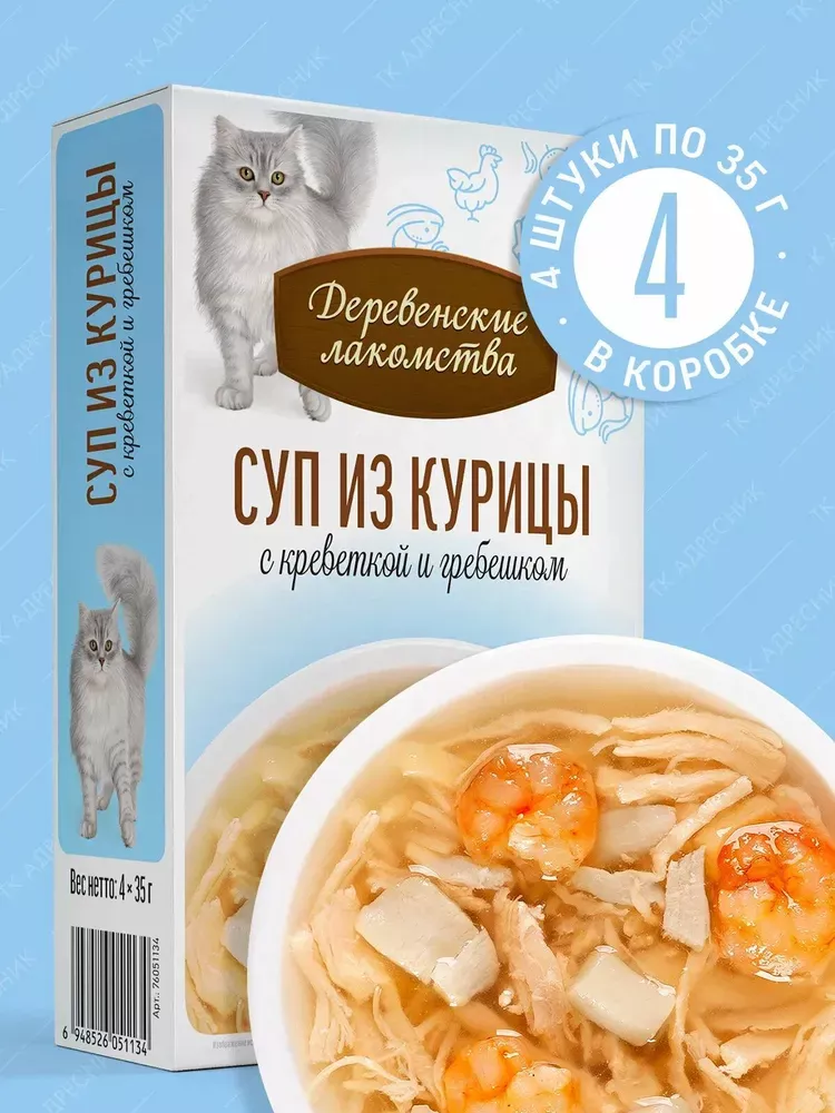 Деревенские лакомства 0,035кг*4шт суп из курицы с креветкой и гребешком, пауч (76051134)