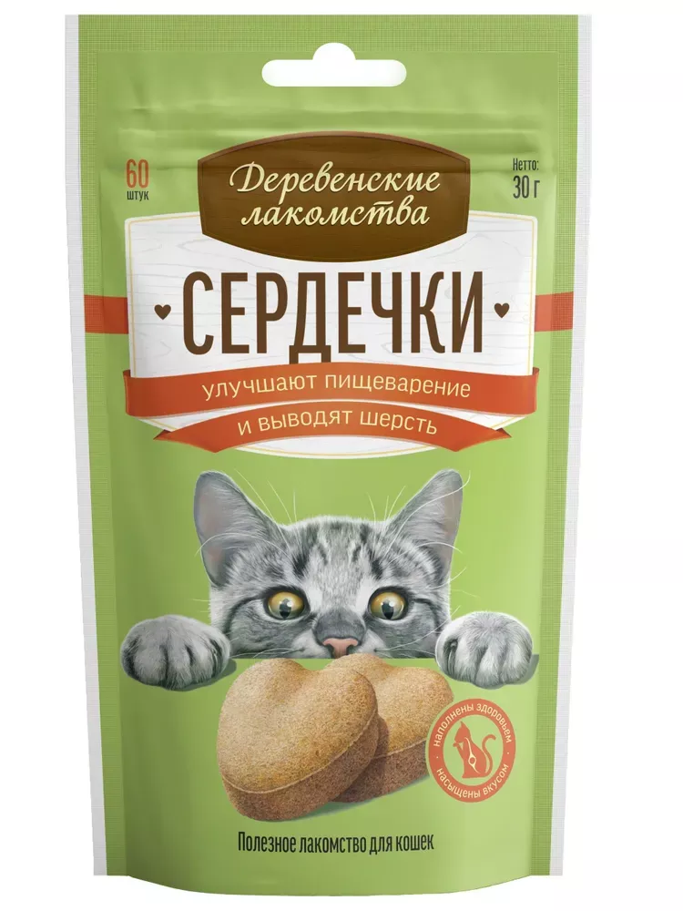 Деревенские лакомства 0,03кг сердечки улучшают пищеварение и выводят шерсть, для кошек (76050779)