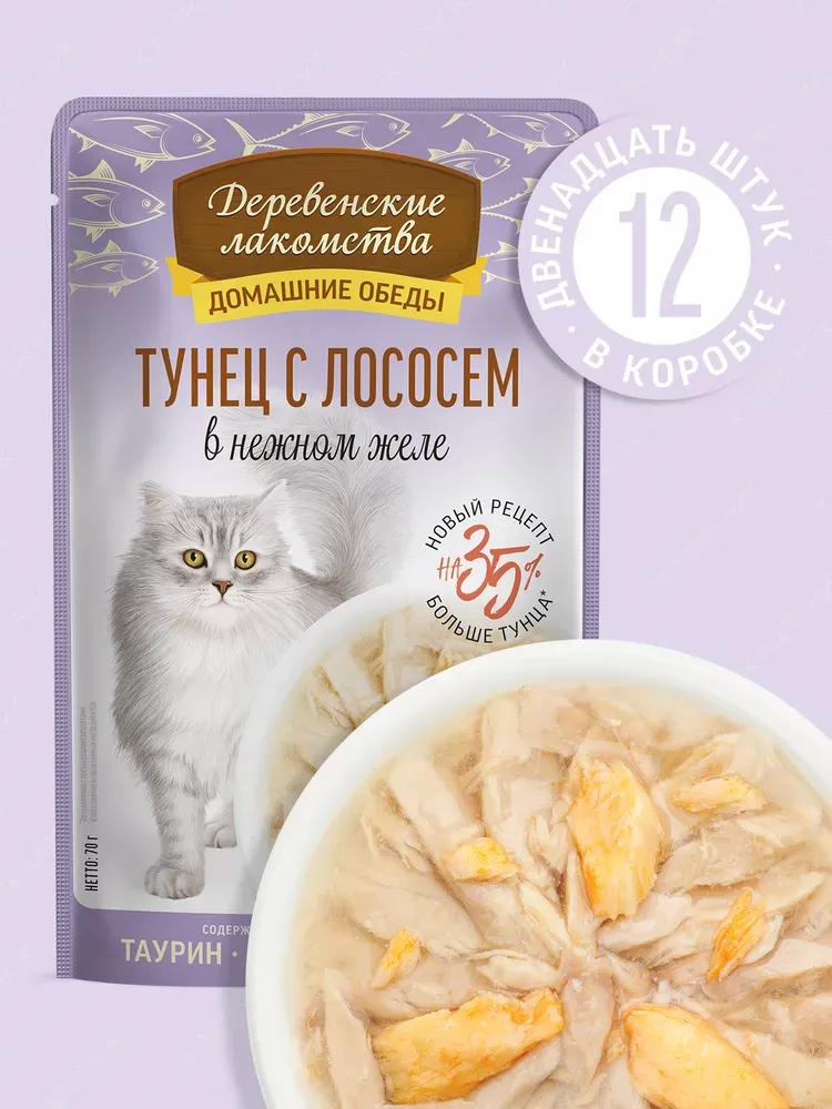 Деревенские лакомства Домашние обеды 0,07кг Тунец с лососем в нежном желе пауч для кошек (79218015) New