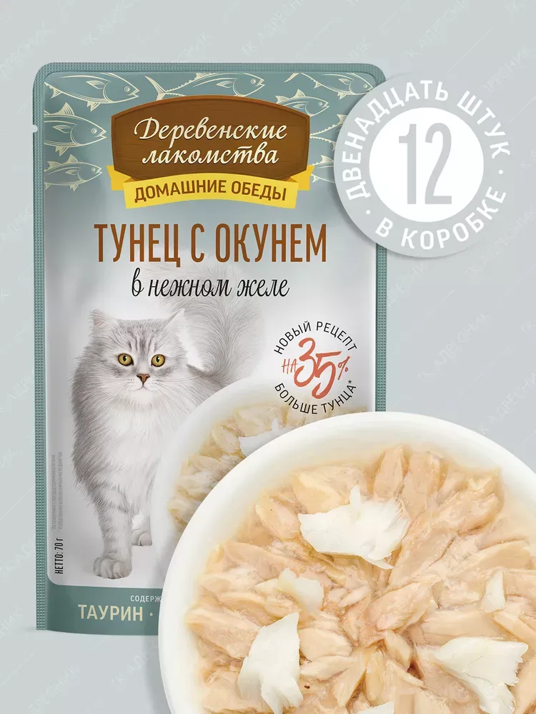 Деревенские лакомства Домашние обеды 0,07кг Тунец с окунем в нежном желе пауч для кошек (79218022) New