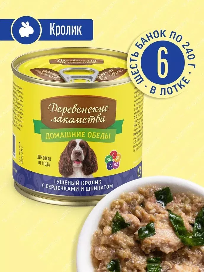 Деревенские лакомства Домашние обеды 0,24кг кролик с сердечками и шпинатом консервы для собак (76135504)