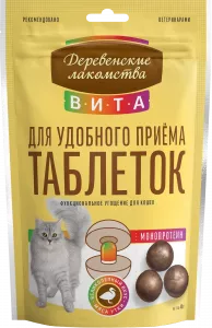 Функциональное угощение для кошек из отборного мяса утки для удобного приема таблеток. Уникальная мягкая текстура угощения «Деревенские лакомства — Вита» позволяет надежно скрыть таблетку или капсулу внутри. Его восхитительный вкус и аромат отвлекут вашего питомца, а удобная текстура позволит легко спрятать лекарство. Теперь забота о здоровье станет проще и приятнее!