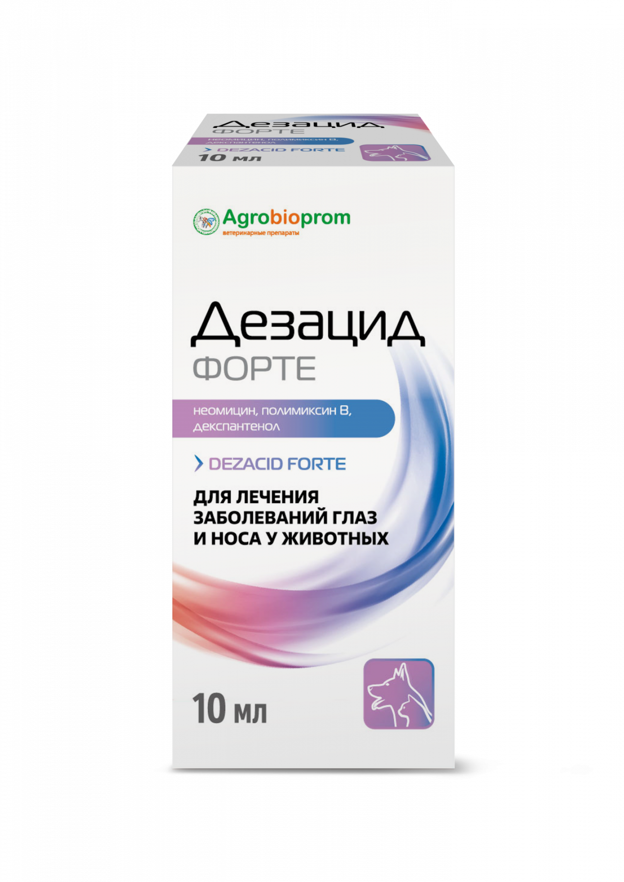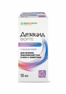Дезацид форте оказывает выраженное противобактериальное, противовоспалительное и регенерирующее действие на ткани глаза и носа животного.