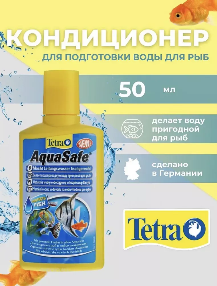 Препарат Tetra 'AquaSafe' для подготовки водопроводной воды в воду, пригодную для обитания аквариумных рыб. В состав входит формула BioExtract для здоровой прозрачной воды!