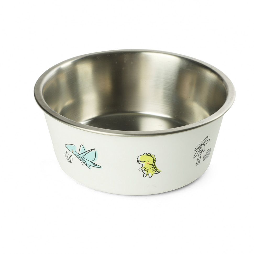Стильная круглая миска из нержавеющей стали 'Динозаврики' с высокими бортиками идеально подходит как для воды, так и для корма разной консистенции. Миска комфортна для питомцев и легко моется под струей проточной воды с использованием бытовых моющих средств. Прорезиненное основание в виде лапки обеспечивает максимальную устойчивость, препятствуя скольжению изделия во время использования, а оригинальный принт сделает такую миску украшением любого интерьера. Цвет изделия: белый с цветным принтом. Объем изделия: 0,35л. Размер изделия: d125*53мм (d дна - 95мм).
