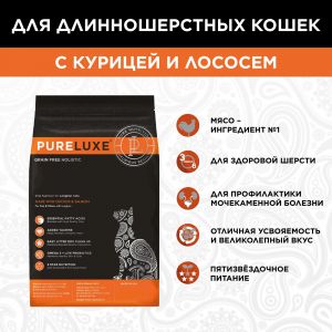 PURELUXE 0,4кг Элитное Питание для длинношерстных кошек с курицей и лососем (940149)