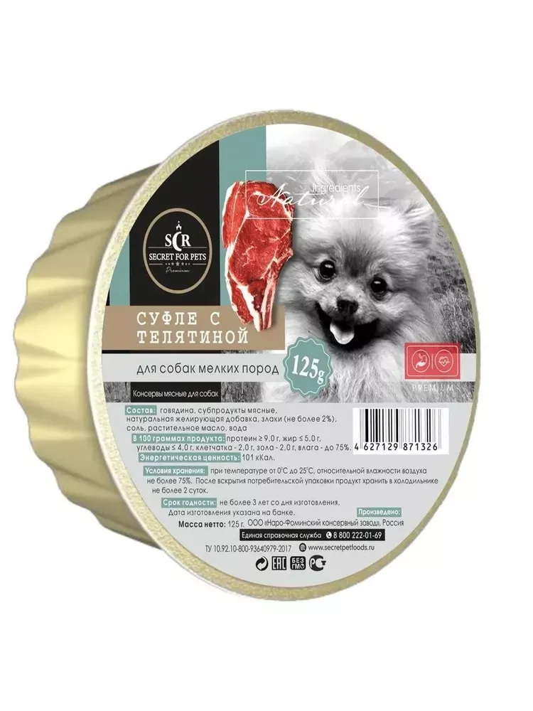 Секрет (Secret) Premium 0,125кг суфле из телятины для мелких пород, консервы для собак (ламистер) (71326)