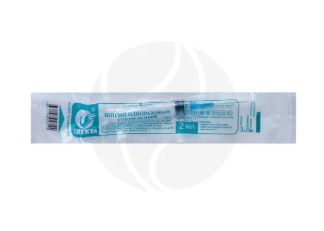 Шприц 2 мл одноразовый трехкомпонентный с иглой 0,6х25мм (23G*1). Применяется для инъекций лекарственных средств.