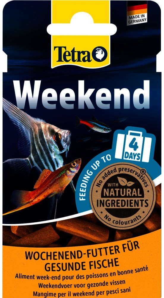 С кормом Tetra Weekend даже ненадолго оставить тропических декоративных рыбок одних больше не повод для угрызений совести. Жизненно важные питательные вещества в этих палочках Tetra обеспечивают оптимальное питание ваших рыбок до четырёх дней. Количество палочек зависит от количества и размера рыбок, а также от размера аквариума. Необходимые минералы и белки обеспечивают здоровое питание во время вашего отсутствия. Ещё одним преимуществом является то, что вам не нужно беспокоиться о загрязнении воды по возвращении. Помимо лёгкой в употреблении формулы, корм Tetra Weekend легко усваивается, что способствует поддержанию чистоты воды и её качества. Палочки не содержат красителей и консервантов и обеспечивают оптимальный рост даже в ваше отсутствие. Tetra Weekend — это дополнительный корм для декоративных рыбок. Он не заменит сбалансированное питание в долгосрочной перспективе.