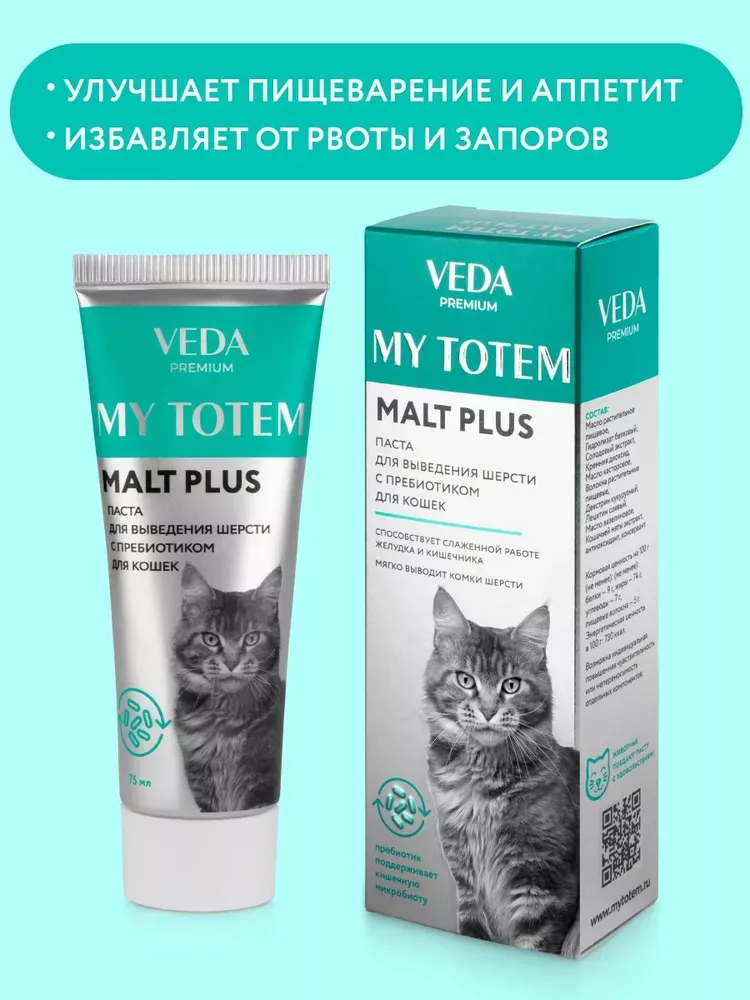 VEDA My Totem Malt Plus паста для выведения шерсти с пробиотиком для кошек, 75мл